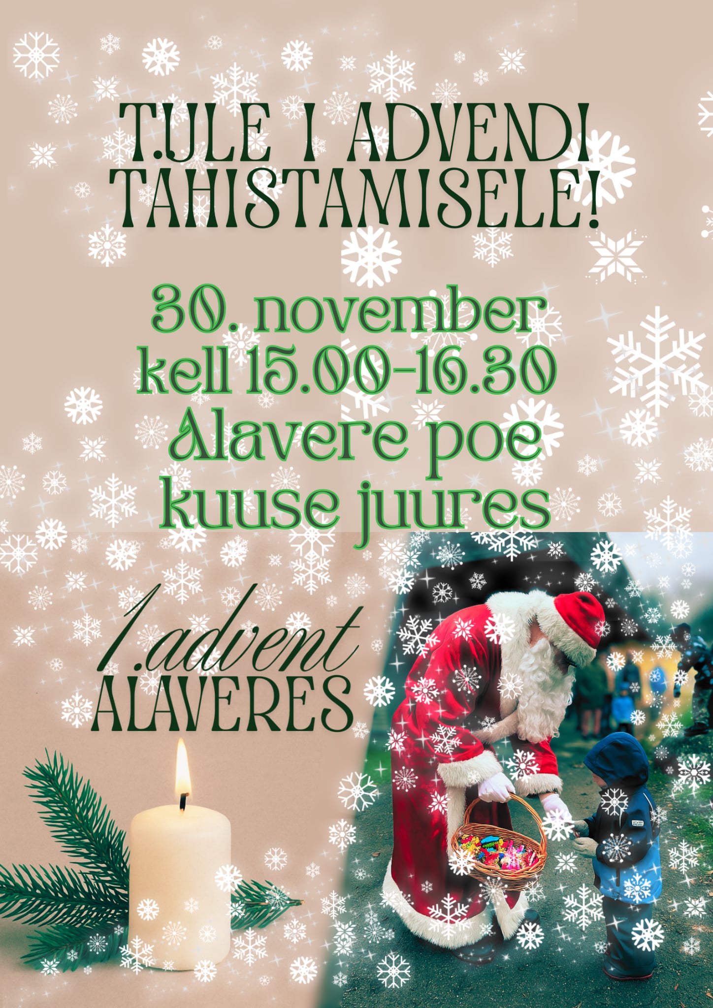Tule pere ja sõpradega viimasel novembrikuu päeval ühisele 1. advendiküünla süütamisele Alavere poe kuuse juurde.
