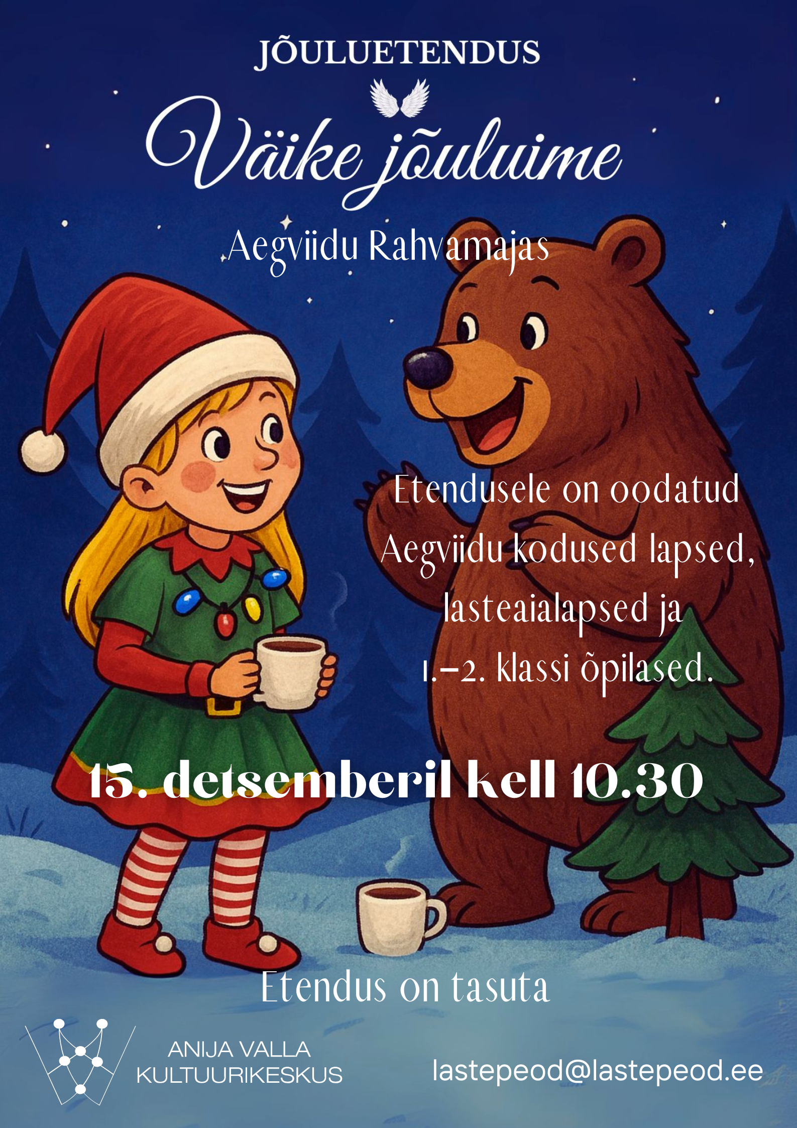 Jõuluetendusele on oodatud Aegviidu piirkonna kodused lapsed, lasteaialapsed ja 1.-2. klassi õpilased.