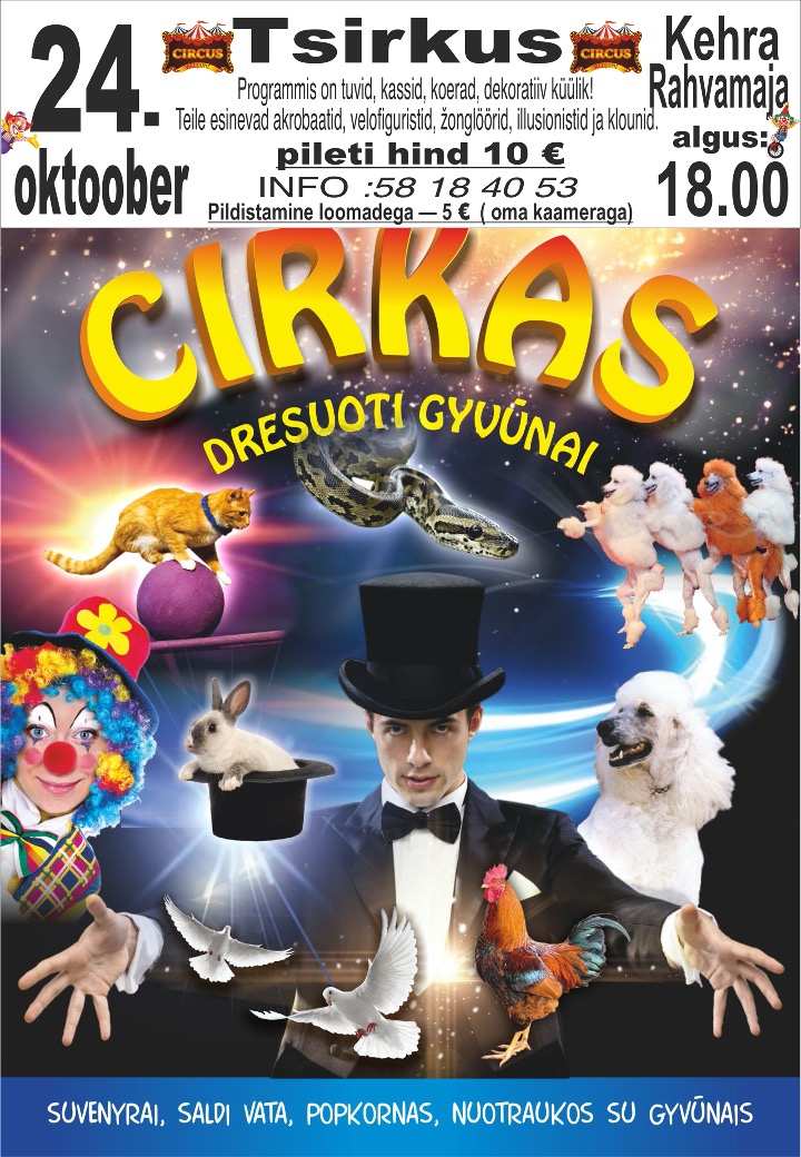 Esmaspäeval, 24. oktoobril kell 18 esineb Kehra Rahvamajas leedu tsirkus CIRKAS. Programmis on tuvid, kassid, koerad ja dekoratiivküülik.Teile esinevad akrobaadid, velofiguristid, žonglöörid, illusionistid ja klounid.