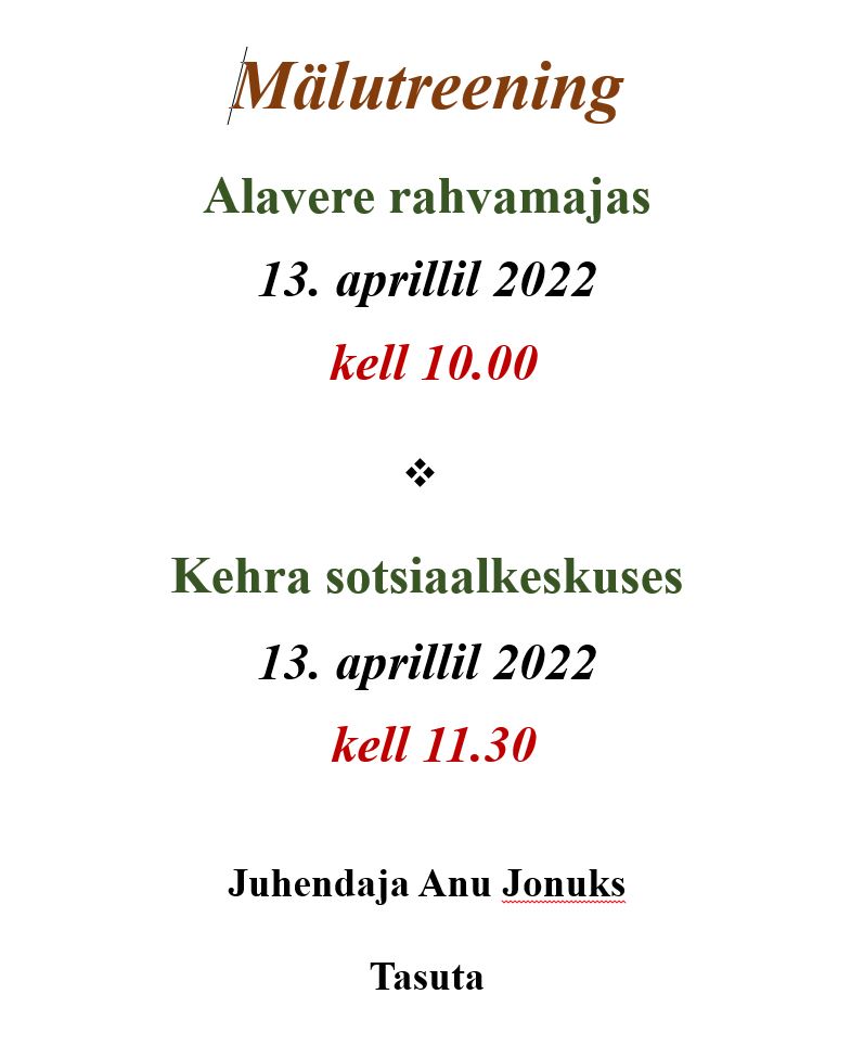 Mälutreening Alavere rahvamajas 13 aprillil 2022
