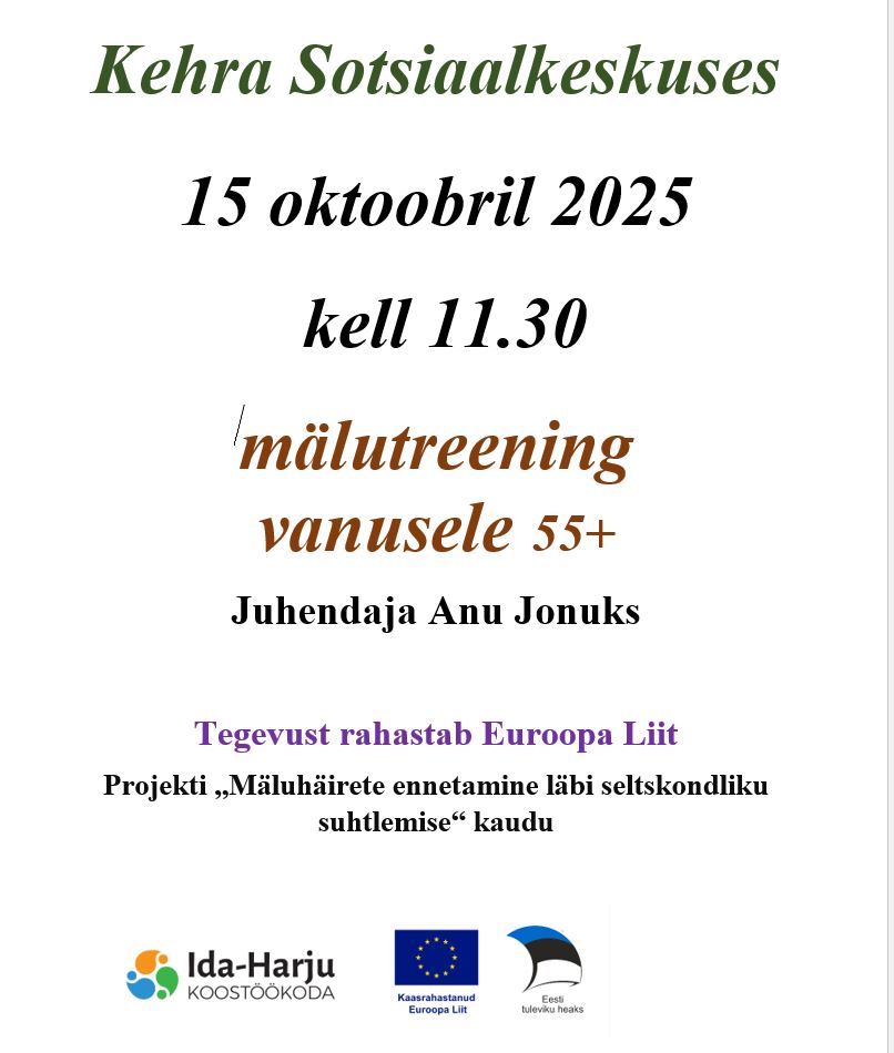 Mälutreening Kehra sotsiaalkeskuses 15 oktoobril kell 11.30