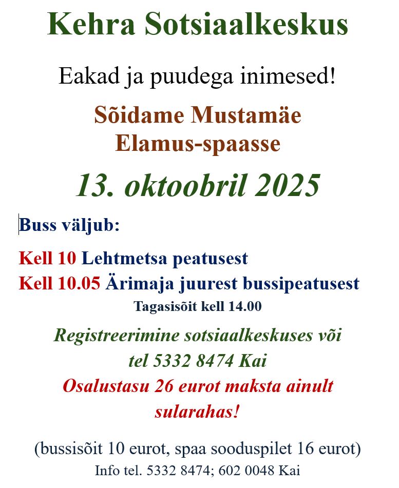 Eakatele ja puudega inimestele sõit Mustamäe Elamus-spaasse 13.10.2025