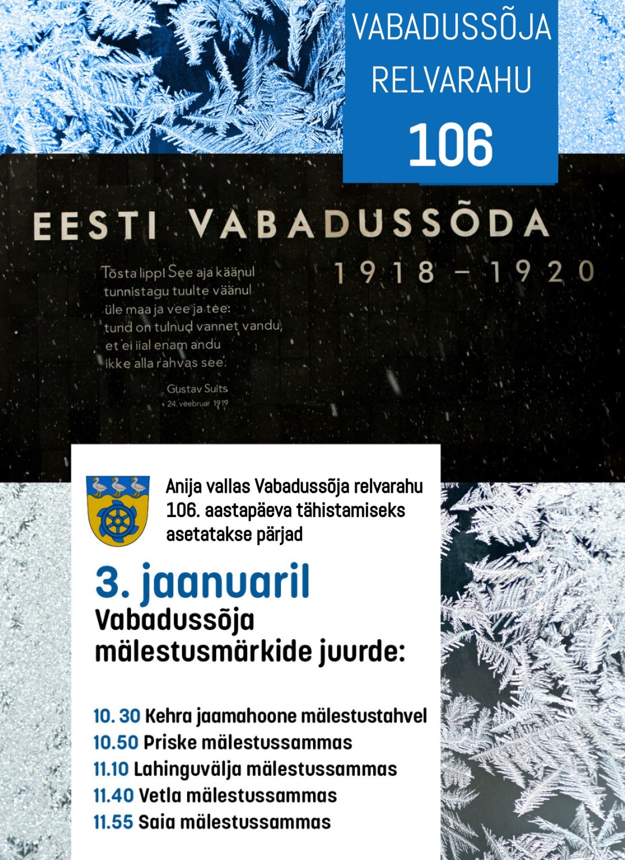 Link3. jaanuaril Anija vallas Vabadussõja relvarahu 106. aastapäeva tähistamiseks asetatakse pärjad Vabadussõja mälestusmärkide juurde: